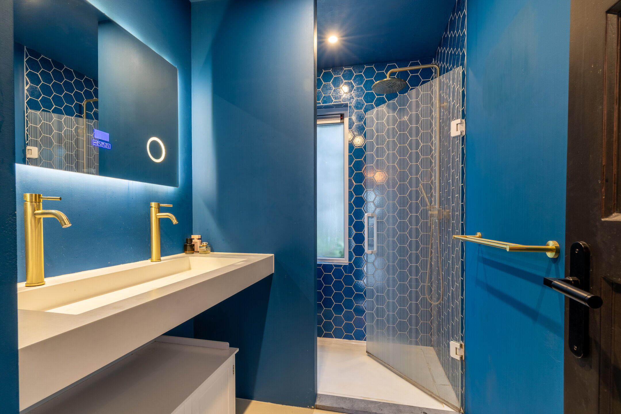 De badkamer (ca. 2.83 x 1.71m) beschikt over een royale inloopdouche met een glazen deur, hand- en regendouche, een brede dubbele wastafel met messing bedieningselementen, een handige bergnis, moderne gietvloer en diverse plafondspots.
