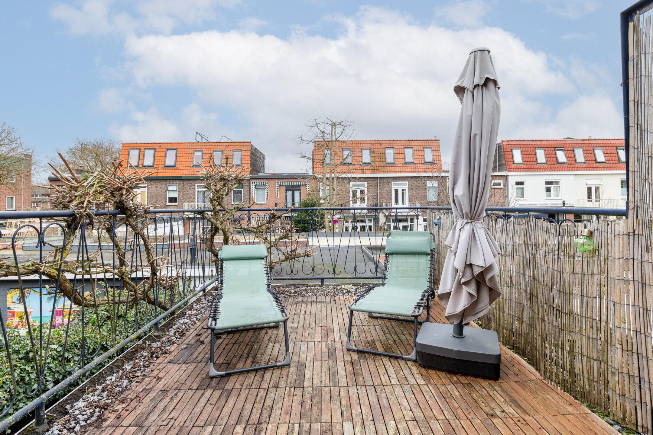 Het dakterras (ca. 4.50 x 2.65m) is voorzien van hardhouten vlonders, is heerlijk stil en biedt een fijn uitzicht over de wijk.