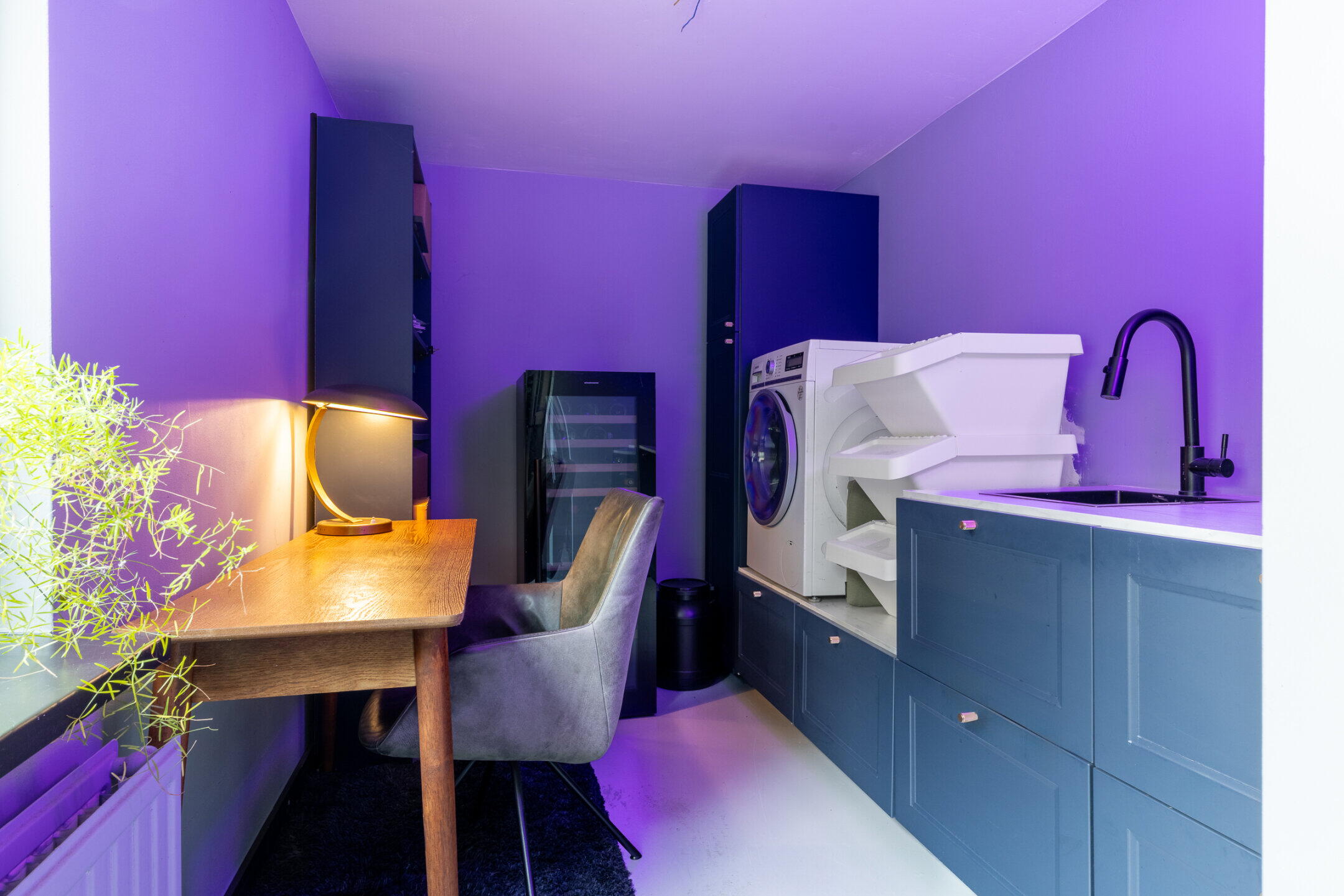 De werkkamer – slaapkamer 1 (ca. 4.33 x 2.17m) is voorzien van een moderne gietvloer, een strakke wand- en plafondafwerking, een keukenblok met spoelbak en tevens vinden de we hier de aansluitpunten ten behoeve van de wasapparatuur. De moderne toiletruimte op de begane grond beschikt over een wandcloset met inbouwreservoir.